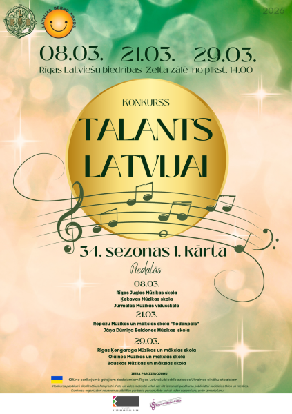 Rīgas Latviešu biedrība, sadarbībā ar Latvijas Bērnu fondu un Valsts kultūrkapitāla fonda atbalstu, laipni aicina uz konkursa Talants Latvijai 34. sezonas 1. kārtu, kas tradicionāli notiek koncertcikla formātā Rīgas Latviešu biedrības Zelta zālē no plkst. 14.00. Lasīt vairāk ... |