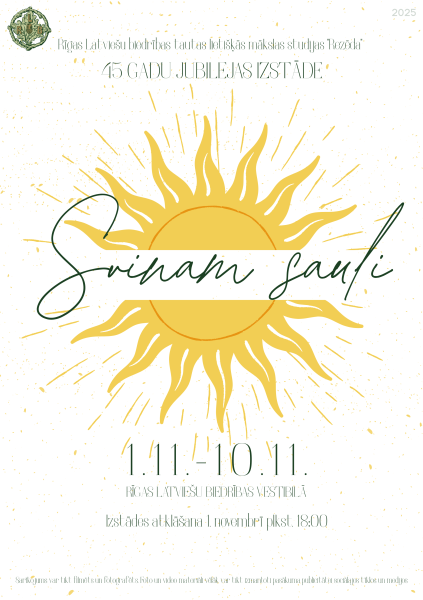 Rīgas Latviešu biedrības tautas lietišķās mākslas studijas “Rezēda” aicina apskatīt savu 45 gadu jubilejas izstādei ”Svinam sauli” Rīgas Latviešu biedrības 1. stāva vestibilā.