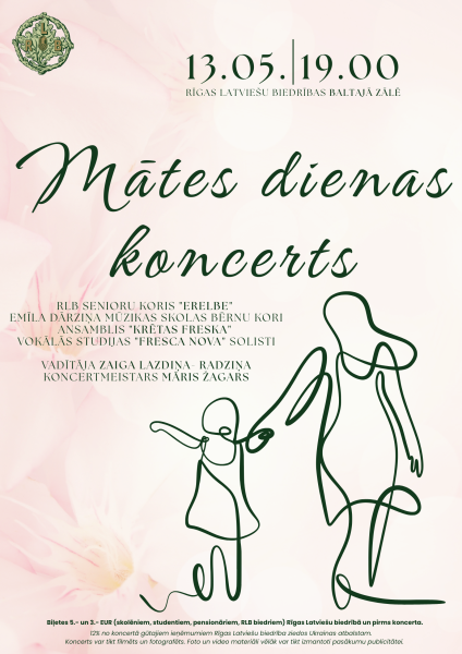 Rīgas Latviešu biedrības senioru koris “Erelbe” aicina uz Mātes dienas koncertu 13. maijā plkst. 19.00 Rīgas Latviešu biedrības Baltajā zālē.