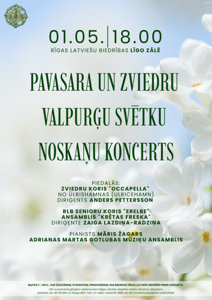 Rīgas Latviešu biedrības senioru koris "Erelbe" sadarbībā ar biedrībām Latvija-Zviedrija un Sverige-Lettland (Zviedrija) aicina uz koncertu, kur pavasara atnākšana savīsies ar tradicionālo zviedru Valpurģu nakts noskaņu! Lasīt vairāk ... |