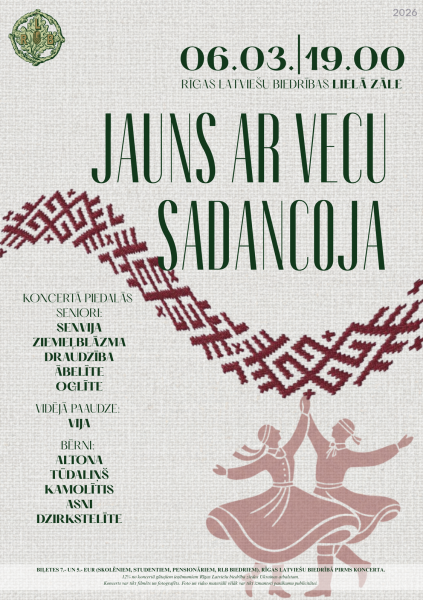 Rīgas Latviešu biedrības senioru deju kolektīvs "SenVIJA" (vadītāja Antra Vilcāne), RLB vidējās paaudzes deju kolektīvs VIJA (vadītāja Keita Straume) un sadraudzības deju kolektīvi jau ceturto gadu aicina savus draugus, lielus un mazus, uz sirsnīgu pavasara sadancošanas koncertu Jauns ar vecu sadancoja 6. martā plkst. 19.00 Rīgas Latviešu biedrības Lielajā zālē. Lasīt vairāk ... |