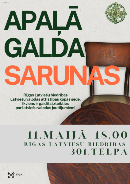 Rīgas Latviešu biedrības (RLB) Latviešu valodas attīstības kopa (LVAK) turpina tradīciju un aicina ikvienu valodas draugu un interesentu uz kārtējo ikmēneša Latviešu valodas attīstības kopas tikšanos. Šī gada 11. maijā plkst. 18.00 RLB nama 301. telpā norisināsies Apaļā galda sarunas, kur brīvā un atvērtā gaisotnē būs iespēja diskutēt par latviešu valodas jautājumiem Lasīt vairāk ... |